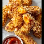 Place the coated cheese sticks on a baking sheet lined with parchment paper to prevent sticking, and freeze them for at least 2 hours. Freezing firmly sets the coating, so it doesn’t melt off during baking, making this step crucial for that perfect crunch.