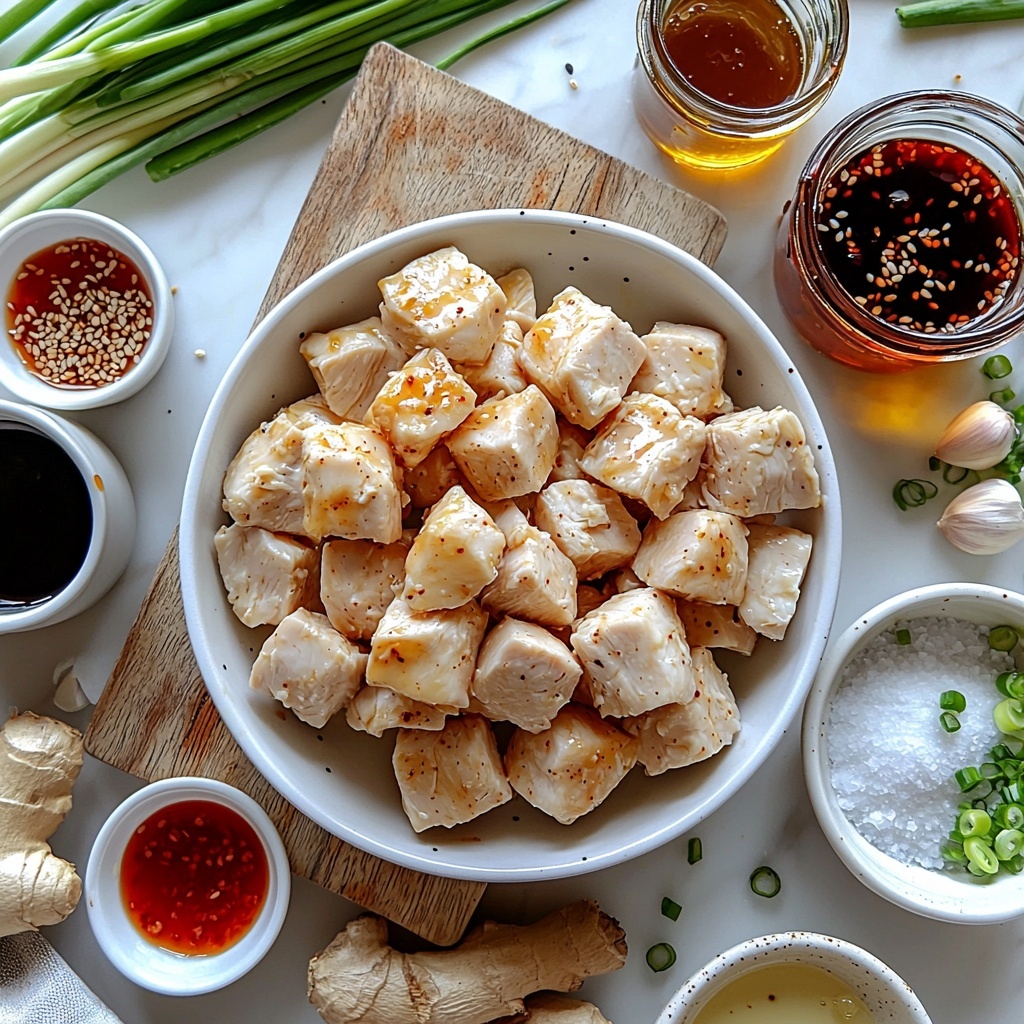 Start by combining the chicken cubes with soy sauce, rice vinegar, cornstarch, grated ginger, minced garlic, salt, and black pepper in a medium bowl. Toss everything well so that every piece is evenly coated with this flavorful mixture. Cover and refrigerate for at least 30 minutes, but letting it sit for up to 2 hours will intensify those delicious flavors. This marinade tenderizes the chicken while building a foundation of bold taste.