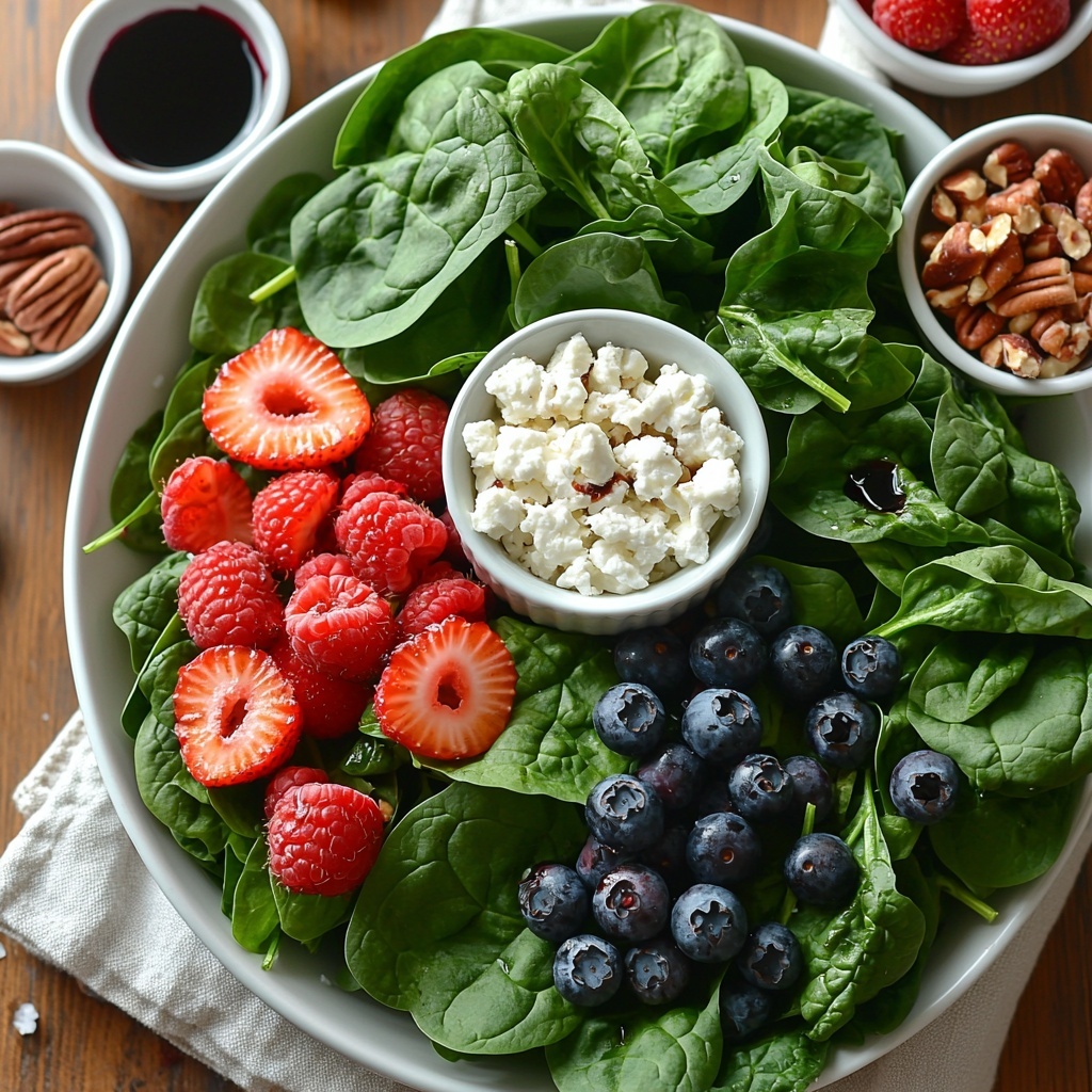 Absolutely! Baby kale, arugula, or mixed greens would work beautifully if you want to vary the texture or flavor profile, though spinach does have that perfect mildness that pairs well with the berries and feta.