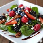 Elevate your Berry Spinach Salad with Pecans, Feta, and Balsamic Glaze Recipe by adding a sprinkle of freshly cracked black pepper or a few extra pecan halves on top for presentation. A small handful of microgreens or fresh mint leaves can also complement the flavors beautifully while enhancing visual appeal.