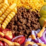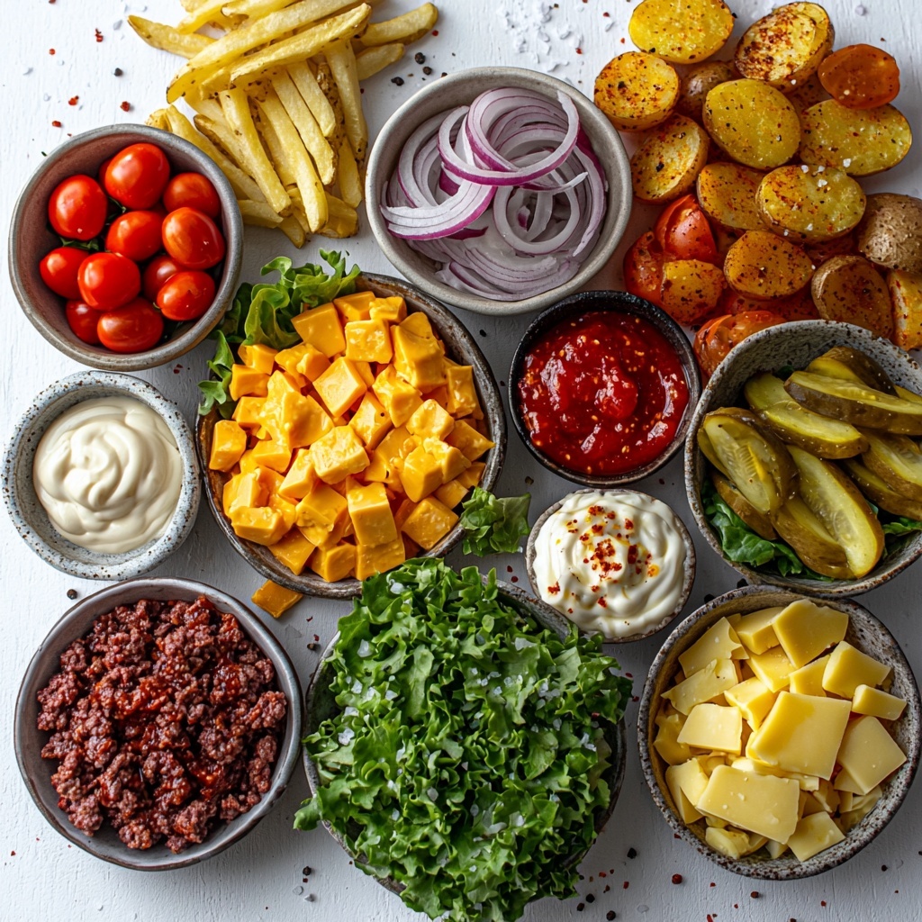 - Assemble the Bowls: Divide the cooked beef and onions evenly among four medium-sized bowls. Top each bowl with chopped romaine lettuce, freshly grated cheddar cheese, sliced cherry tomatoes, sliced dill pickles, cooked potato wedges or French fries, and sliced red onion if using.
