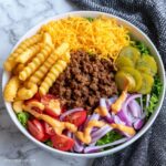 This Cheeseburger Bowls recipe offers a low-carb twist on the classic burger, featuring juicy seasoned ground beef, fresh toppings, and a delicious homemade copycat Big Mac sauce. Perfect for a quick and satisfying meal without the bun.