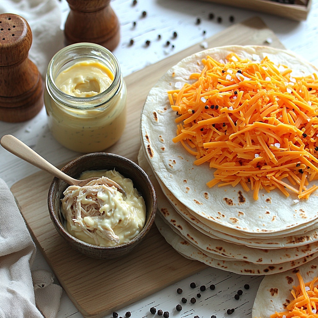 Lay each large tortilla flat on your workspace. Spoon a generous portion of the chicken and aioli mixture right in the center, and then sprinkle the shredded cheddar cheese evenly on top. This layering ensures every bite has a perfect balance of savory chicken and melty cheese.