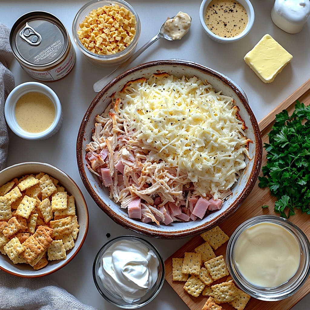 - Add Meats and Layer: Add the cooked chicken and diced ham to the sauce mixture and stir until all the pieces are evenly coated. Spread this mixture evenly into the prepared baking dish and then sprinkle the shredded Swiss cheese over the top layer.