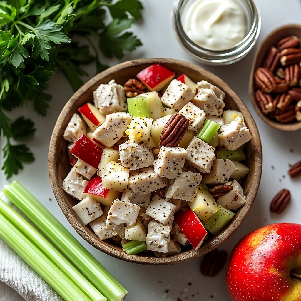 Start by preparing all your ingredients—chop the chicken, celery, and apples into bite-sized pieces. Then, toast the pecans in a dry skillet over medium heat until fragrant and slightly golden, which intensifies their flavor and adds a delightful crunch to your salad.