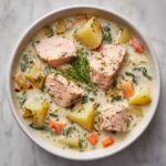 Cozy Salmon Chowder is a warm, comforting soup perfect for chilly days. Made with tender chunks of fresh salmon, aromatic vegetables, creamy milk and cream, and fragrant herbs, this chowder is rich in flavor and easy to prepare. It balances hearty ingredients with a light, creamy broth, making it a delightful meal for seafood lovers.