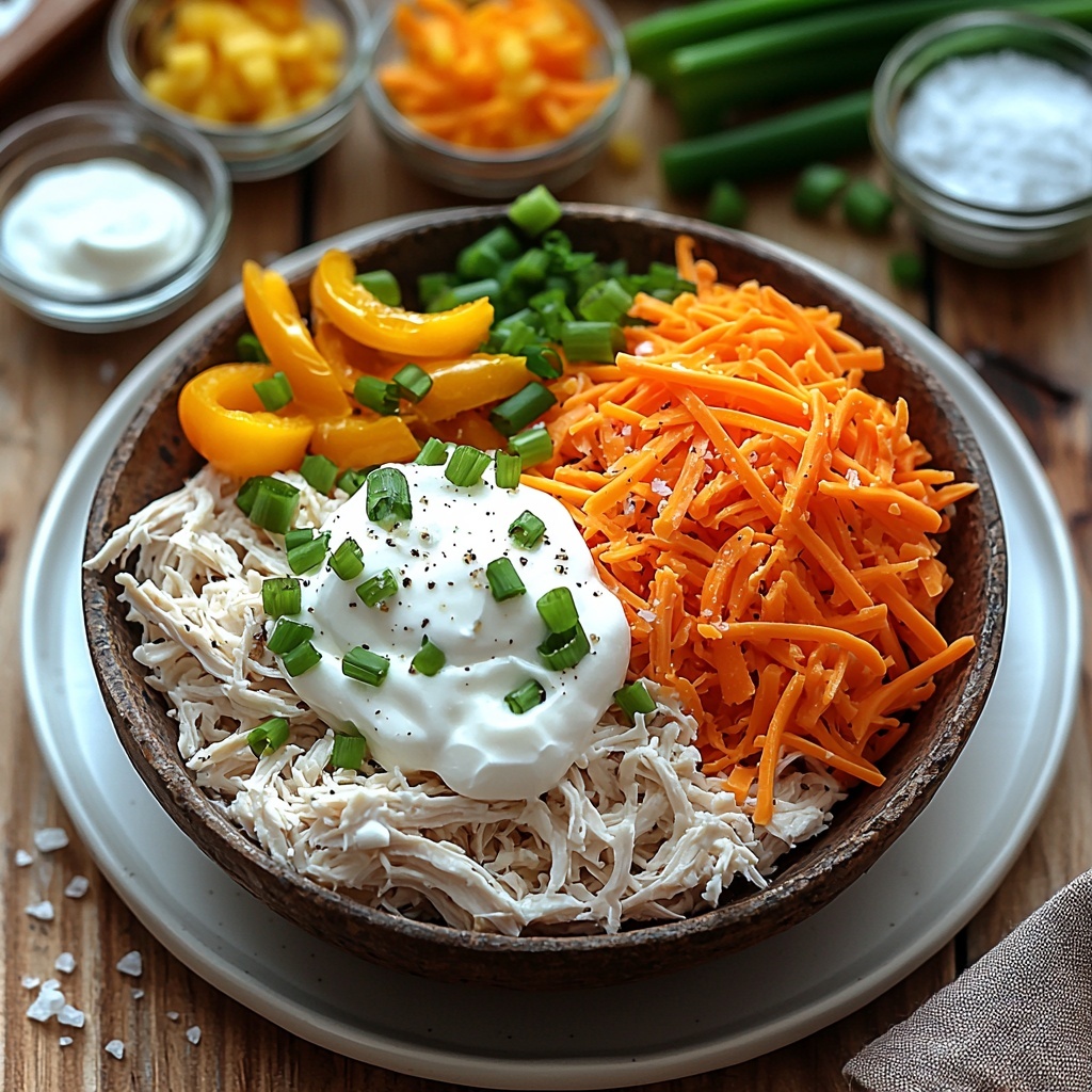 2. Combine Base Ingredients: In a large bowl, mix the shredded cooked chicken with softened cream cheese and sour cream until smooth and well incorporated.