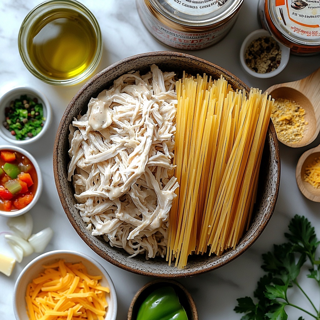 In a large mixing bowl, toss together the shredded cooked chicken, sautéed veggies, cream of chicken soup, cream of mushroom soup, chicken broth, 1 ½ cups of sharp cheddar cheese, diced tomatoes with green chilies, garlic powder, onion powder, and black pepper. Once everything is mixed, fold in the cooked spaghetti, making sure every strand is coated with the luscious sauce and flavors.