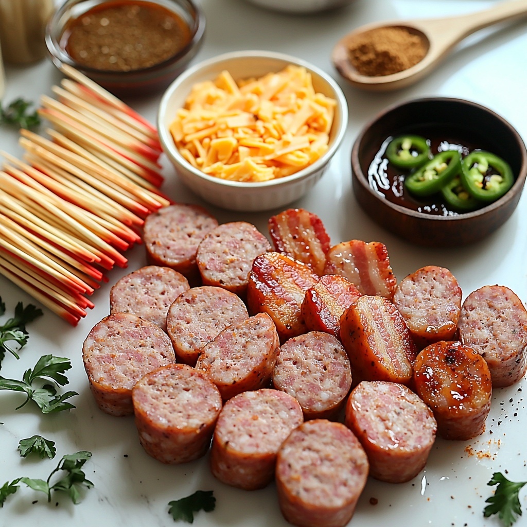 Start by slicing your smoked sausage into 1/2-inch thick rounds—aim for about 24 pieces to match the recipe perfectly. Then, cut your bacon slices in half lengthwise so you get long strips that will wrap neatly around each sausage piece. Wrapping these rounds with the bacon strips and securing them with toothpicks is a little step that brings all the flavors together while setting the stage for that irresistible crunch. Stand each wrap upright, seam side down, which helps them hold their shape and makes filling them super easy.