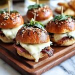 These Crispy Prosciutto and Cheese Sliders are a deliciously savory snack or appetizer featuring layers of melted provolone cheese, crispy prosciutto, and optional fresh greens, all nestled in soft slider buns and brushed with a flavorful garlic herb butter. Baked to golden perfection, these sliders combine crispy, cheesy, and buttery textures making them an ultimate crowd-pleaser perfect for parties or casual gatherings.
