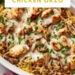 This French Onion Chicken Orzo Casserole combines the rich, caramelized flavors of French onion with tender shredded chicken and creamy cheeses, all baked to bubbly perfection. A comforting one-pot meal featuring orzo pasta simmered in a savory broth, finished with melted mozzarella and Parmesan for a hearty, delicious dinner.