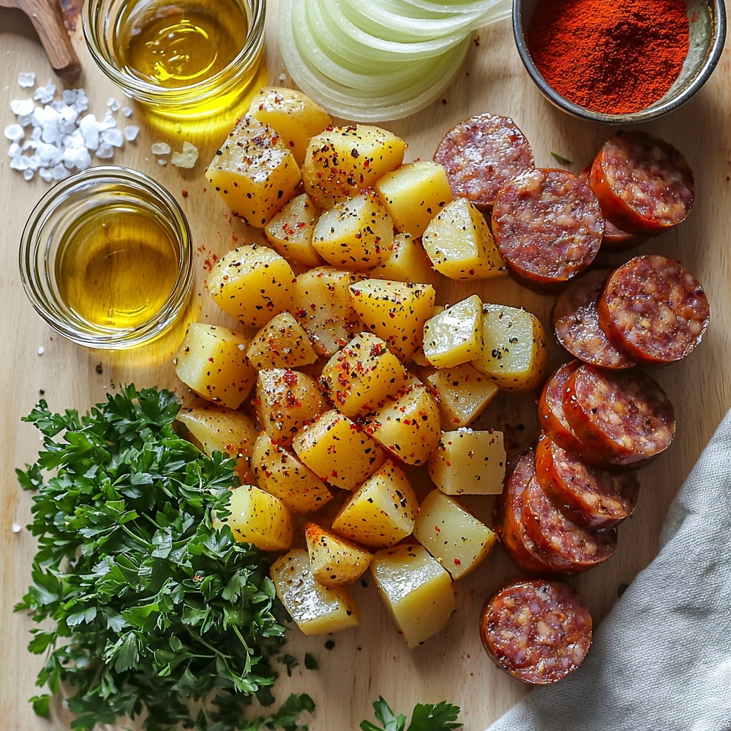 Start by dicing the Yukon Gold potatoes into evenly sized cubes, ensuring they cook evenly to that perfect crispy golden stage. Slice the smoked Polish sausage into rounds to let those smoky edges develop as they cook. Lastly, thinly slice the yellow onion to allow it to soften and caramelize beautifully alongside the sausage.