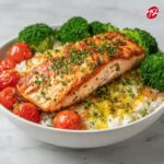 A delicious and wholesome Garlic Butter Salmon Bowl featuring perfectly pan-seared salmon fillets in a rich garlic butter sauce, served over steamed broccoli, fresh cherry tomatoes, and fluffy rice. This quick and flavorful dinner is ready in just 25 minutes, making it an ideal weeknight meal packed with protein and vibrant vegetables.