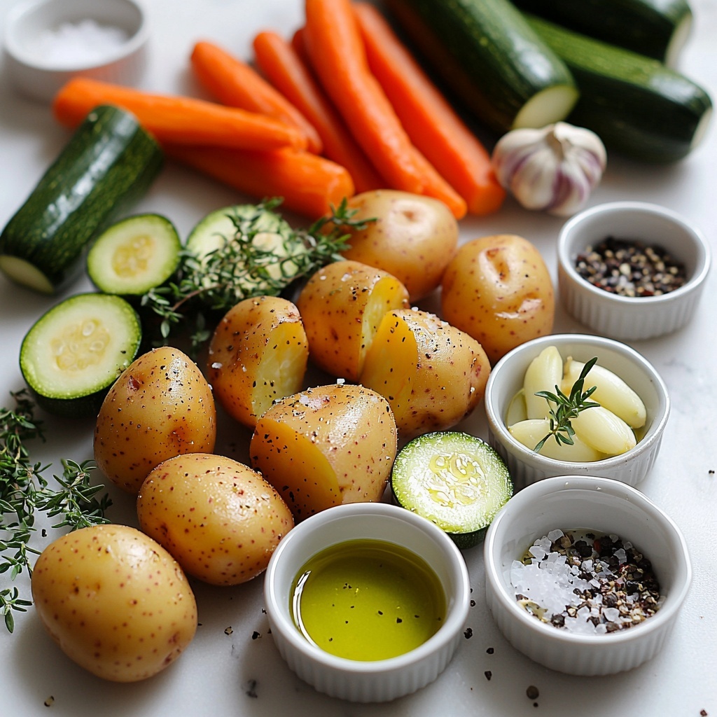 Simple, fresh ingredients create the magic in this Garlic Herb Roasted Potatoes, Carrots, and Zucchini Recipe. Each one plays a crucial role, from the earthy baby potatoes and sweet carrots to the tender zucchini, while olive oil and aromatic herbs bring it all together with vibrant flavor and perfect texture.