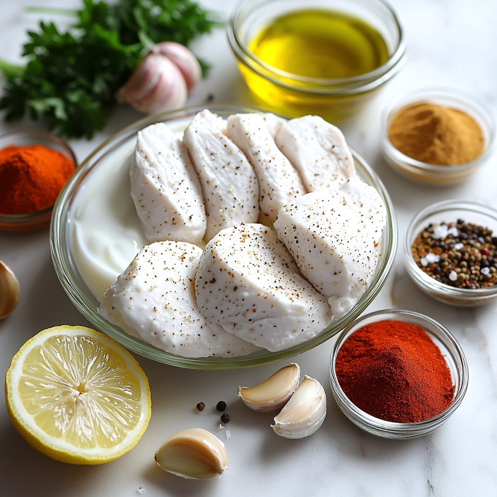 This recipe calls for straightforward, pantry-friendly ingredients that come together to create a harmonious blend of flavors and textures. Each ingredient plays a crucial role: the Greek yogurt brings creaminess and tenderness, while the spices provide depth and warmth, creating a vibrant dish that’s as colorful on the plate as it is delicious.