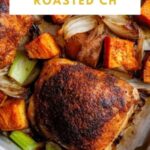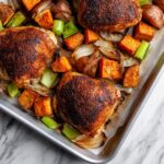 A flavorful roasted chicken thighs recipe marinated in a savory blend and roasted alongside a medley of seasonal vegetables including potatoes, sweet potatoes, carrots, celery, and shallots. This one-pan meal is easy to prepare, featuring crispy chicken skin and tender, caramelized vegetables, perfect for a comforting dinner.