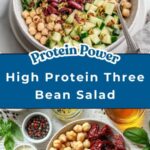This High Protein Three Bean Salad is a quick, healthy, and delicious dish packed with protein-rich beans, fresh vegetables, and a flavorful homemade vinaigrette. Perfect as a light meal or a satisfying side, this salad combines kidney beans, white beans, and chickpeas with marinated artichoke hearts, sun-dried tomatoes, cucumbers, parmesan cheese, and fresh herbs for a vibrant, nutrient-dense dish. The tangy vinaigrette made with extra virgin olive oil, red wine vinegar, and a hint of honey complements this refreshing salad beautifully, making it ideal for any occasion.