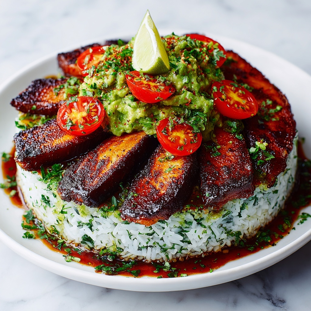 A vibrant and healthy 25-minute dinner featuring tender honey lime marinated chicken served over fluffy white rice and topped with a fresh avocado and cilantro salad. This easy-to-make chicken and avocado rice stack combines tangy, sweet, and savory flavors for a nutritious and satisfying meal perfect for busy weeknights.