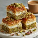 Honey Pistachio Baklava Cheesecake is a decadent fusion dessert combining the crisp, buttery layers of phyllo dough with a smooth, creamy cheesecake filling, topped with a sweet and crunchy honey-pistachio glaze. This unique dessert blends Mediterranean-inspired flavors with classic cheesecake for a rich and elegant treat perfect for special occasions or indulgent moments.