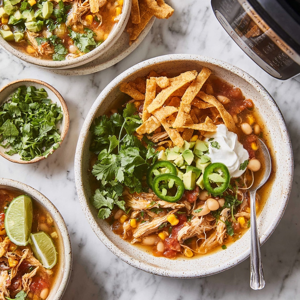 This Instant Pot White Chicken Chili is a flavorful and comforting dish featuring tender shredded chicken, cannellini beans, poblano peppers, and a blend of spices. Cooked quickly under pressure, it delivers a perfect balance of creamy and spicy elements, topped with fresh garnishes for a satisfying meal.