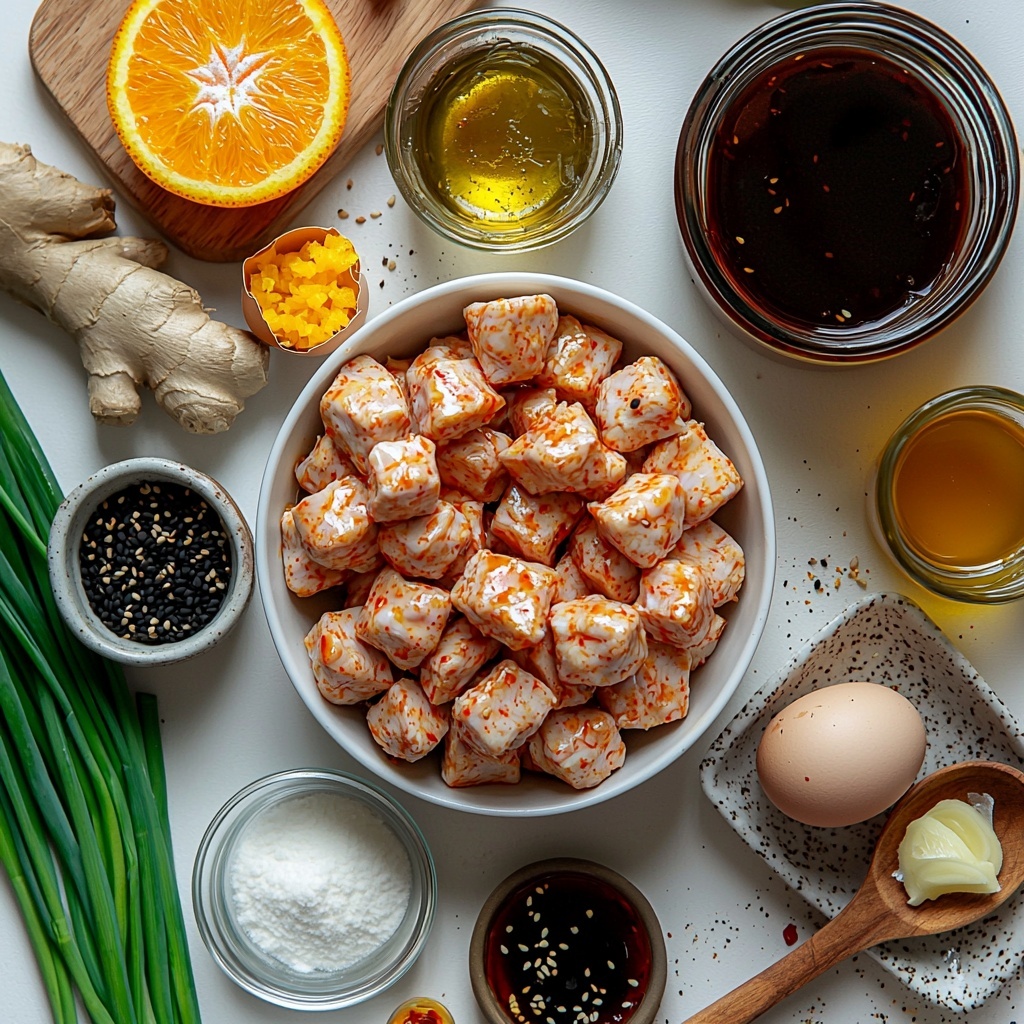 - Marinate the chicken: In a large bowl, combine the cubed chicken, egg white, tamari or soy sauce, orange zest, and black pepper. Mix thoroughly to coat each piece evenly, allowing the flavors to infuse.