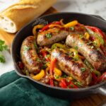 This classic Italian Sausage and Peppers recipe features savory beef Italian sausage cooked with colorful bell peppers, onions, and garlic in a flavorful tomato sauce. Served on toasted hoagie rolls and topped with melted provolone cheese and fresh basil, it’s a comforting and hearty meal perfect for any occasion.