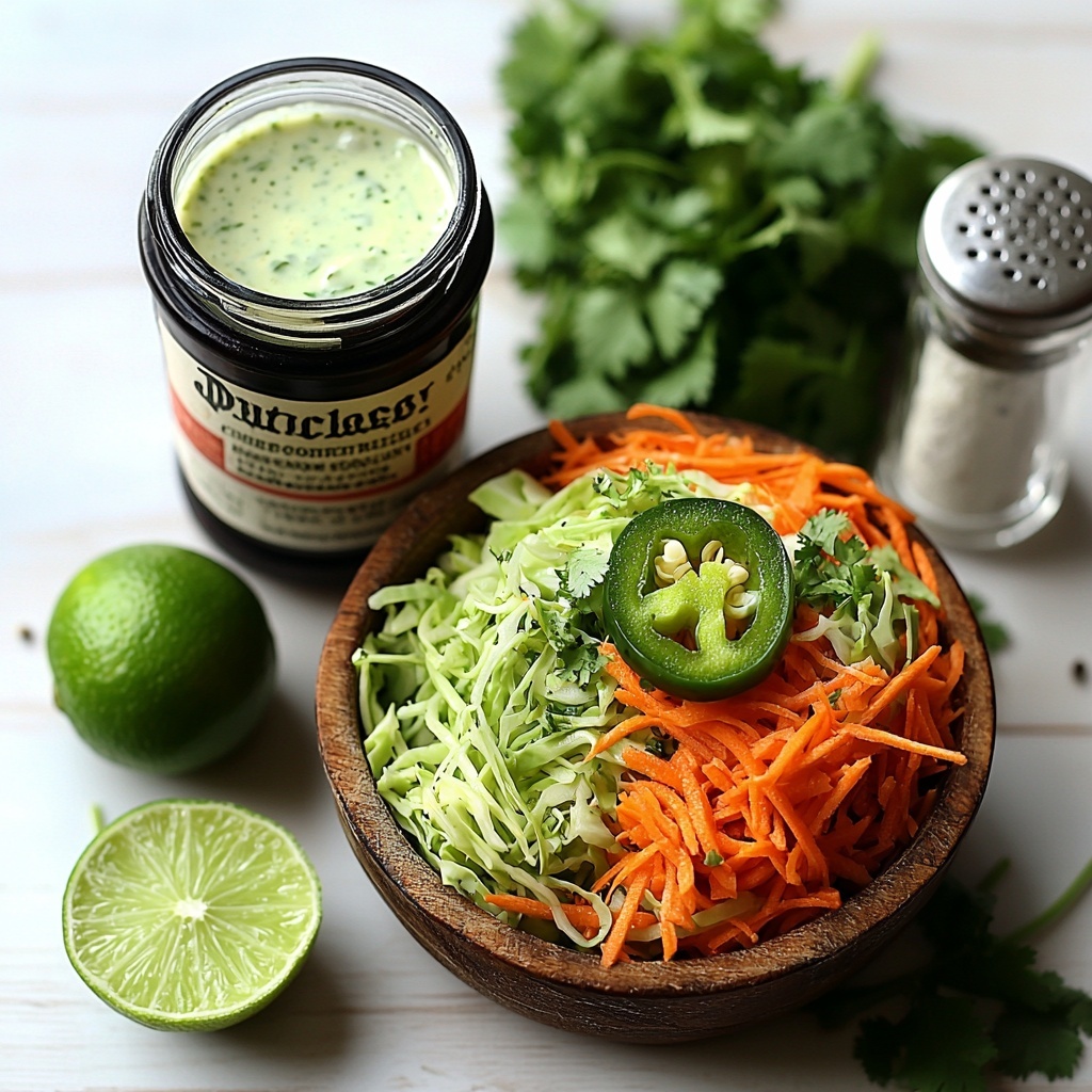 A refreshing and zesty Jalapeño Lime Ranch Slaw combining crisp shredded cabbage and carrots with spicy jalapeños, fresh cilantro, and a creamy lime-infused ranch dressing. Perfect as a side dish or light meal with a bright, tangy flavor and a hint of heat.
