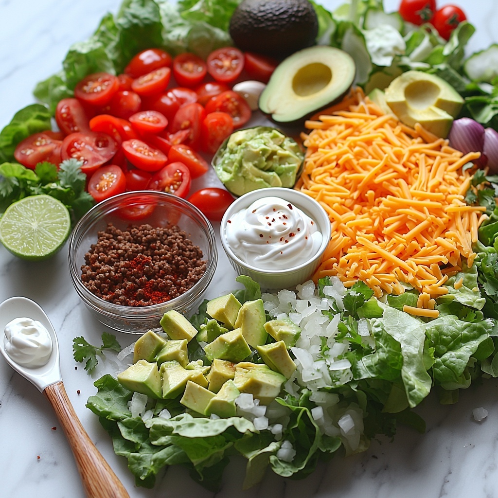 Gathering your ingredients for this dish is a breeze, yet each one plays a critical role in building layers of flavor, color, and texture. From the hearty ground beef to the fresh cilantro, every component is carefully chosen to create a harmonious Keto Beef Taco Lettuce Wraps Bowl Recipe.