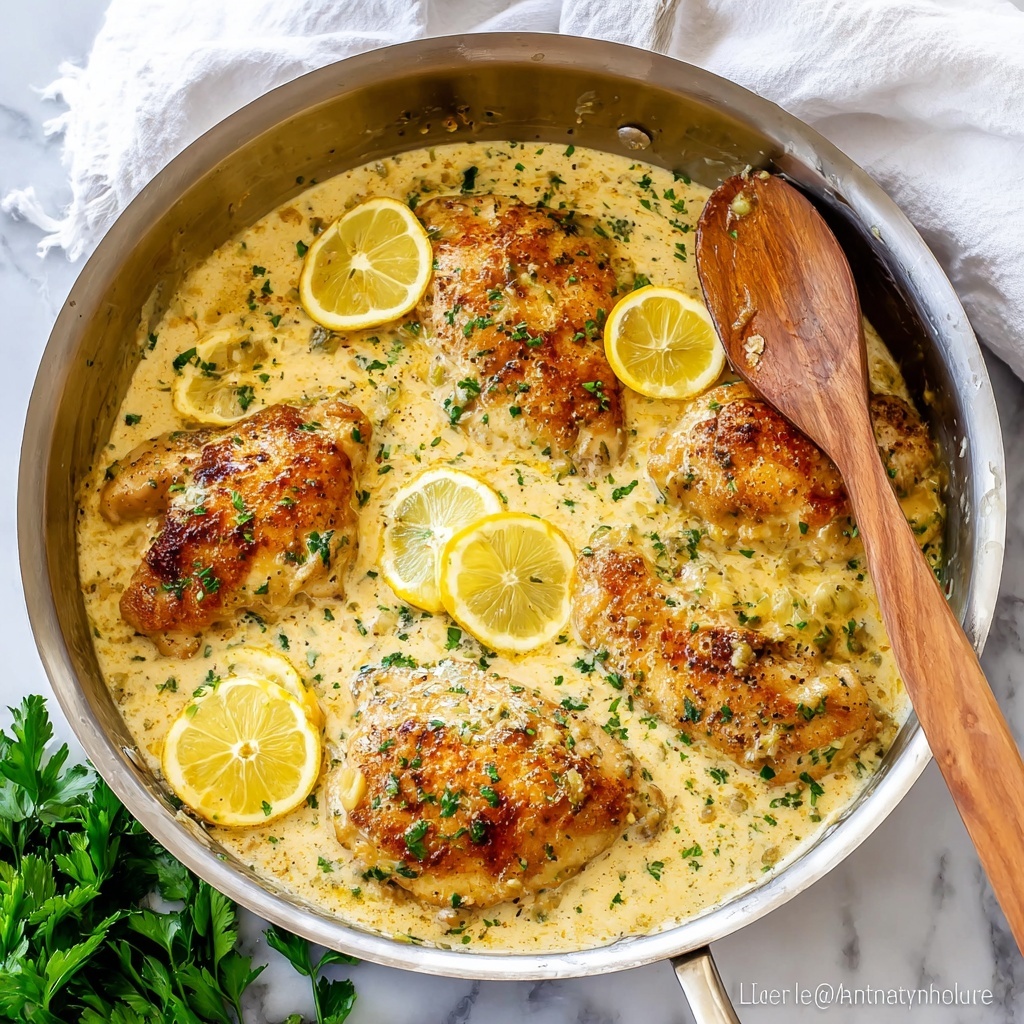 This Lemon Garlic Chicken recipe features tender, pan-seared chicken breasts smothered in a creamy, tangy lemon garlic sauce enriched with Parmesan cheese and fresh herbs. The sauce is made with a white wine reduction, garlic, and a creamy roux-based broth, delivering a rich yet bright flavor perfect for an elegant weeknight dinner or special occasion.