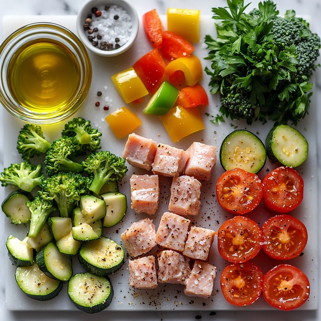This recipe calls for a handful of simple yet essential ingredients that work together beautifully to create a symphony of flavor and color. Each element plays a crucial role, from the protein-packed chicken to the crisp, garden-fresh veggies, all enhanced by aromatic garlic and herbs.