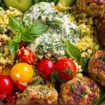 This Mediterranean Bowl features flavorful ground turkey meatballs seasoned with herbs and spices, served over a bed of cooked quinoa or brown rice and topped with fresh vegetables, kalamata olives, crumbled feta, and creamy tzatziki sauce. A vibrant, healthy meal perfect for a quick dinner packed with Mediterranean flavors.