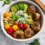 This Mediterranean Bowl features flavorful ground turkey meatballs seasoned with herbs and spices, served over a bed of cooked quinoa or brown rice and topped with fresh vegetables, kalamata olives, crumbled feta, and creamy tzatziki sauce. A vibrant, healthy meal perfect for a quick dinner packed with Mediterranean flavors.