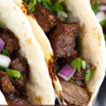 8. Assemble the Tacos: Place warm steak pieces on each tortilla. Top with freshly chopped cilantro, diced red onion, and a squeeze of fresh lime juice to taste.