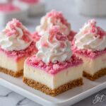 Delight in these No-Bake Pink Velvet Cheesecake Bites, a creamy and colorful treat perfect for any occasion. Featuring a buttery graham cracker crust topped with a smooth, fluffy pink cheesecake filling, these bite-sized desserts require no oven time and set beautifully in the refrigerator. Garnished with whipped cream and pink sprinkles, they bring a playful, elegant touch to your dessert table.