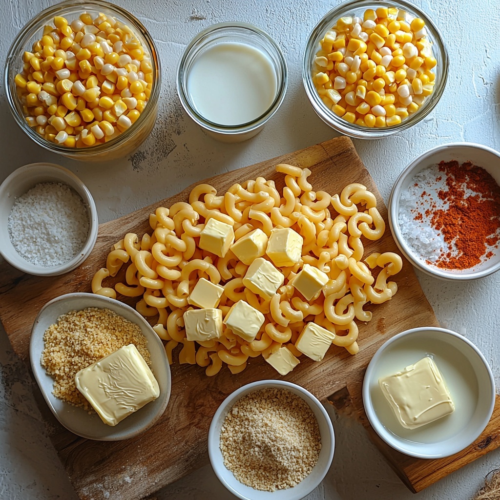Gathering the right ingredients for this One-Dish Corn Mac and Cheese Recipe is a breeze since each component plays a vital role in flavor, texture, and that beautiful golden color. From the creamy Velveeta to the mix of whole kernel and cream-style corn, every ingredient adds its own special touch to the dish.