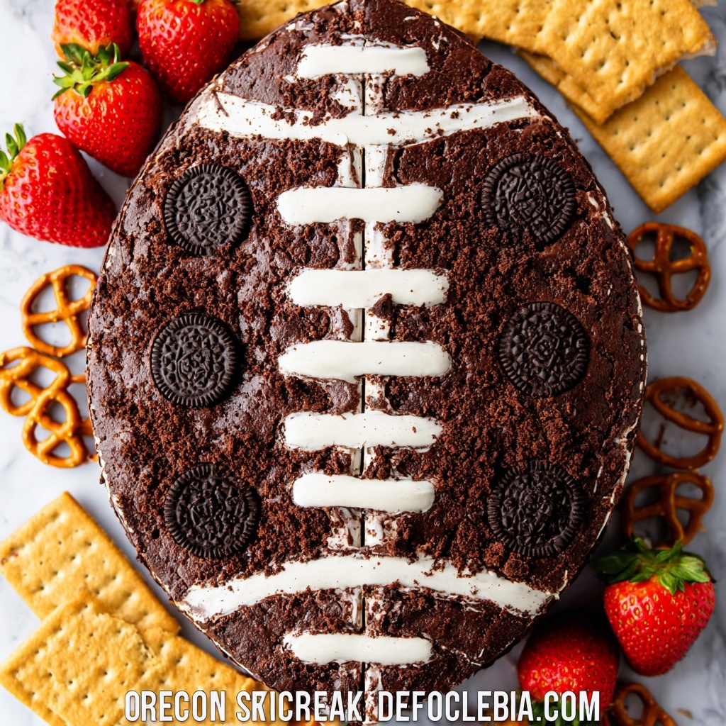 This Oreo Cream Cheese Football Dip is a fun and festive no-bake dessert, perfect for game day or any casual gathering. Combining creamy softened cream cheese and butter with sweet powdered and brown sugars, rich cocoa powder, and crushed Oreo cookies, this dip is shaped like a football and decorated with extra Oreo crumbs and white frosting laces, making it both visually appealing and irresistibly delicious. Serve with graham crackers, pretzels, or fruit for a crowd-pleasing treat.