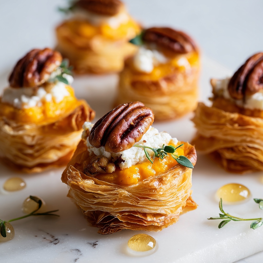 Sprinkle a pinch of the finely chopped roasted salted pecans on top of each filled cup. These add welcome crunch and a salty contrast. Pop the tray in the oven and bake for 15 to 18 minutes, watching as the pastry turns golden and flaky while the Brie melts and the pumpkin filling firms slightly.