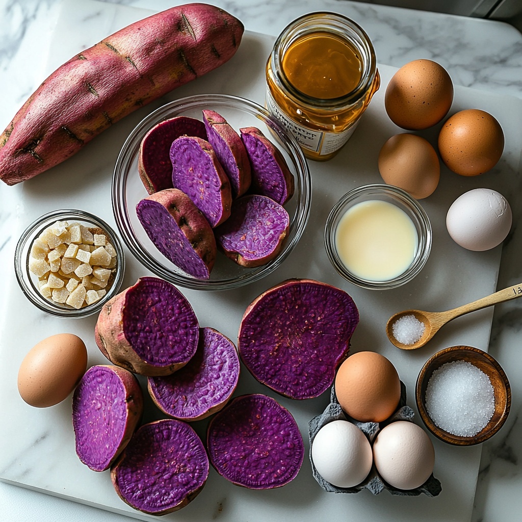 This recipe keeps things simple with straightforward ingredients that contribute layers of flavor, color, and texture. Each item plays an essential role—from the rich sweetness of Stokes purple sweet potatoes to the silky, glossy Swiss meringue that crowns the pie perfectly.