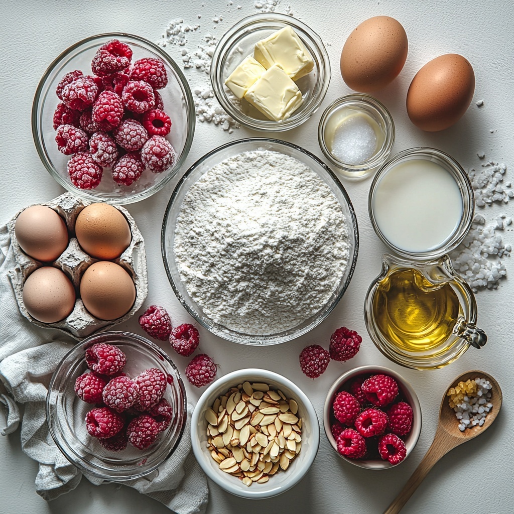 This Raspberry Almond Cake with Buttercream Recipe requires simple but carefully chosen ingredients that come together to create its signature texture and flavor. Each one plays a crucial role—from the tender cake crumb to the silky buttercream to the vibrant raspberry filling.