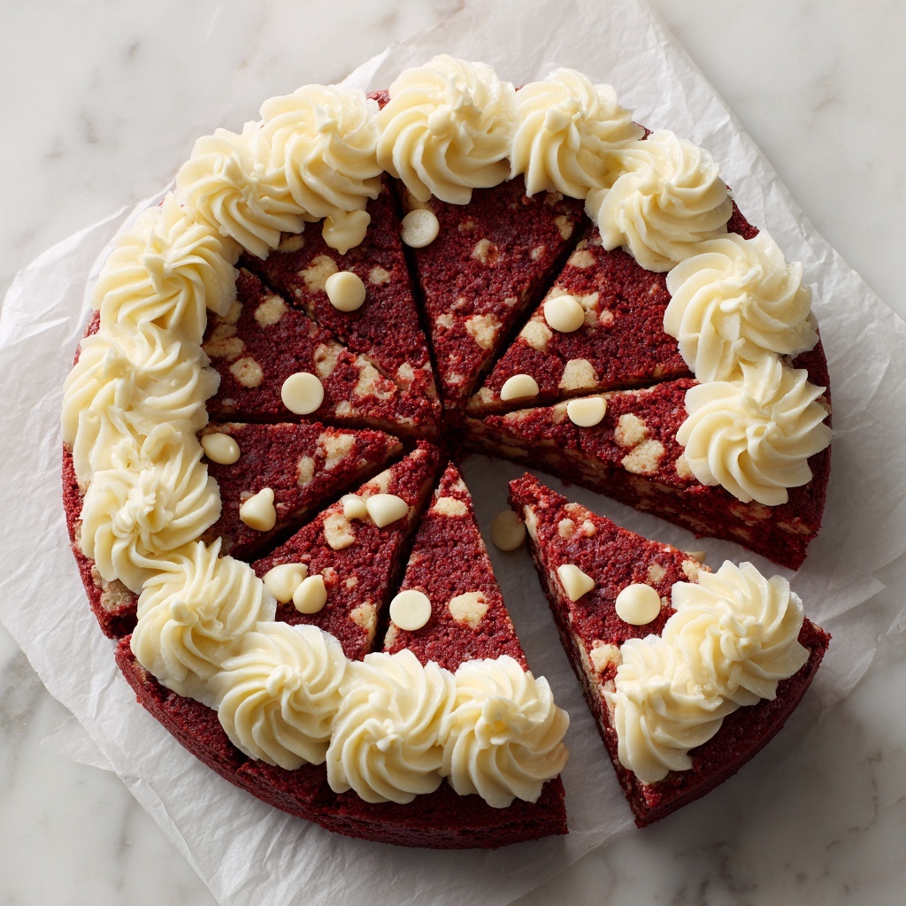 Enhance the beauty and flavor by sprinkling some more white chocolate chips or delicate red velvet crumbs on top of the frosting border. Fresh berries like raspberries or strawberries can also add a wonderful pop of sweetness and color contrast to this indulgent dessert.