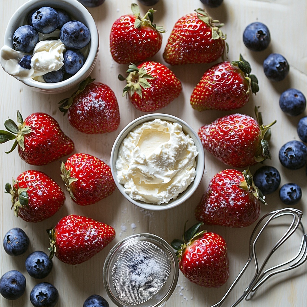 Every ingredient in the Red, White, and Blue Cheesecake Stuffed Strawberries Recipe is purposeful and straightforward, blending classic flavors with fresh fruit to create a stunning and delicious treat. Let’s break down what goes into these irresistible bites.