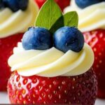 Celebrate with these delightful Red, White, and Blue Cheesecake Strawberries, featuring creamy cheesecake filling piped onto fresh strawberries and topped with juicy blueberries. A patriotic, no-bake dessert that’s perfect for summer gatherings or any occasion needing a touch of festive flair.
