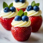 Celebrate with these delightful Red, White, and Blue Cheesecake Strawberries, featuring creamy cheesecake filling piped onto fresh strawberries and topped with juicy blueberries. A patriotic, no-bake dessert that’s perfect for summer gatherings or any occasion needing a touch of festive flair.