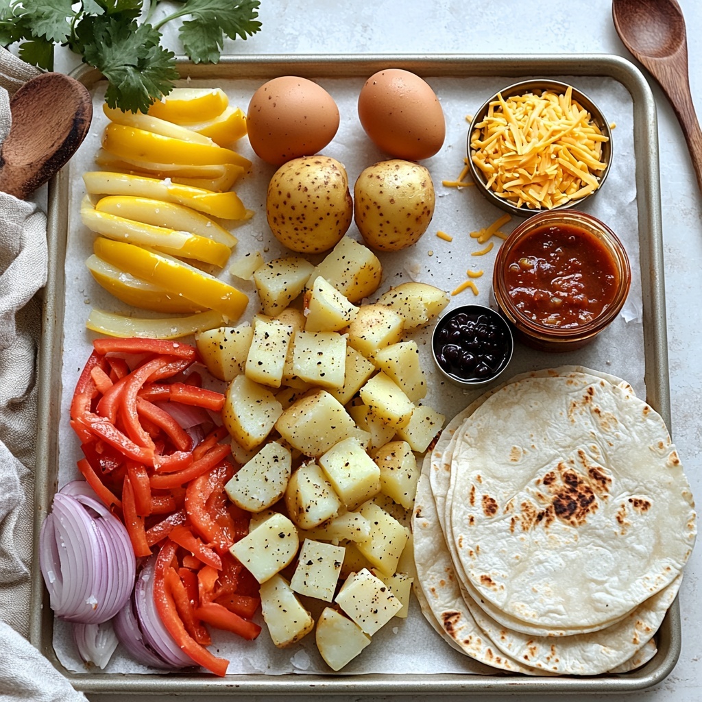 This Sheet Pan Breakfast Burritos recipe combines roasted potatoes, bell peppers, onions, scrambled eggs, refried black beans, and smoked gouda cheese all wrapped in large tortillas. The veggies are roasted for deep flavor, and the eggs are baked right on the pan for easy prep. These burritos can be enjoyed fresh or frozen for convenient make-ahead breakfasts, served with salsa or a creamy chipotle sauce for extra zest.