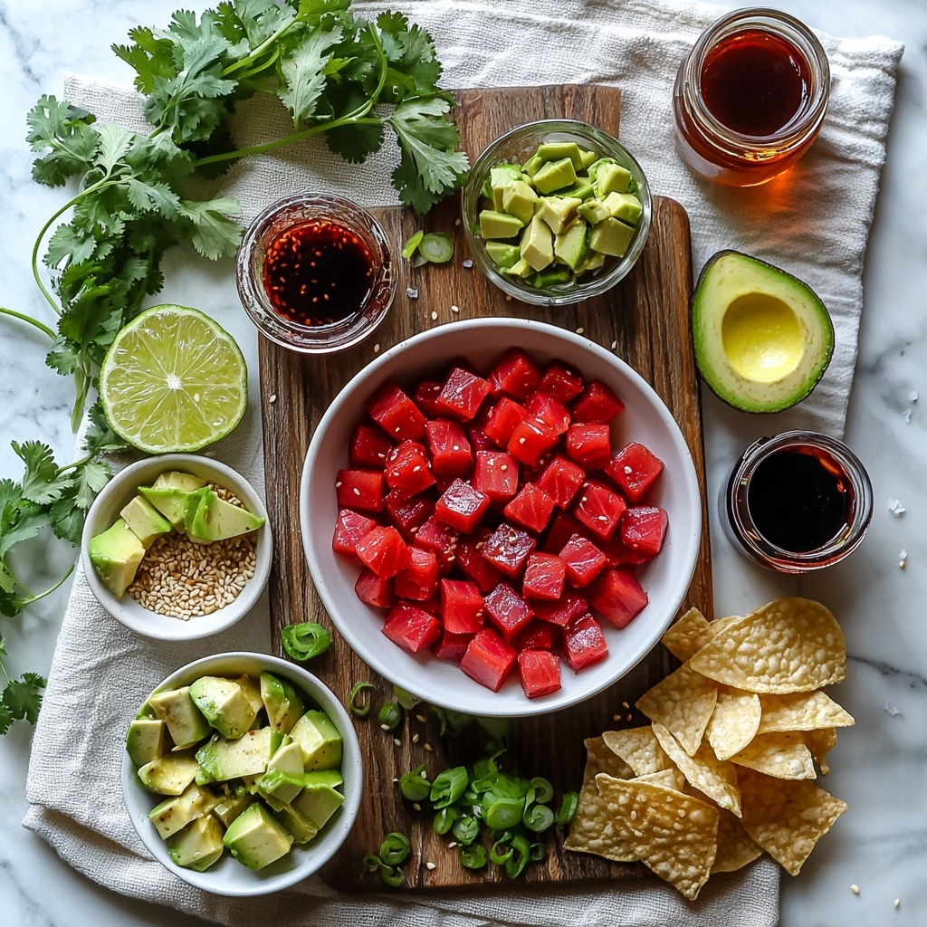 Getting the ingredients right is the secret to making this dish shine, and luckily, they are simple yet essential. Each element adds something special—like the richness of the tuna, the heat from the sriracha, and the crunch of freshly fried wonton chips—coming together to create a dish full of flavor, color, and texture.