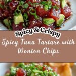 A vibrant and flavorful Spicy Tuna Tartare served with crispy homemade wonton chips. This elegant appetizer combines fresh sushi-grade tuna tossed in a zesty, spicy dressing with creamy avocado, garnished with scallions, cilantro, and toasted sesame seeds. Perfect for entertaining or a light meal.
