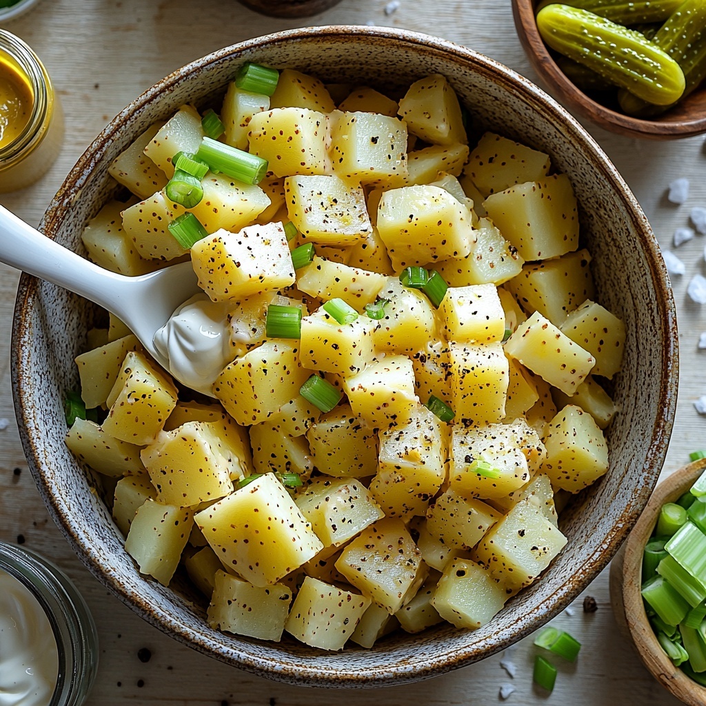 To the dressing, gently fold in the cooled potatoes along with the chopped green onions, diced celery, and chopped pickles. These fresh additions add layers of flavor and texture, ensuring each bite has a perfect balance of creamy, crunchy, and tangy elements. Season carefully with salt and pepper, tasting as you go to get it just right.