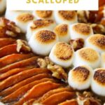 A delicious and comforting Sweet Potato Scalloped Potatoes recipe featuring thinly sliced sweet potatoes baked with a spiced brown sugar butter sauce, topped with toasted mini marshmallows and chopped walnuts. Perfect for holiday meals or any cozy occasion.