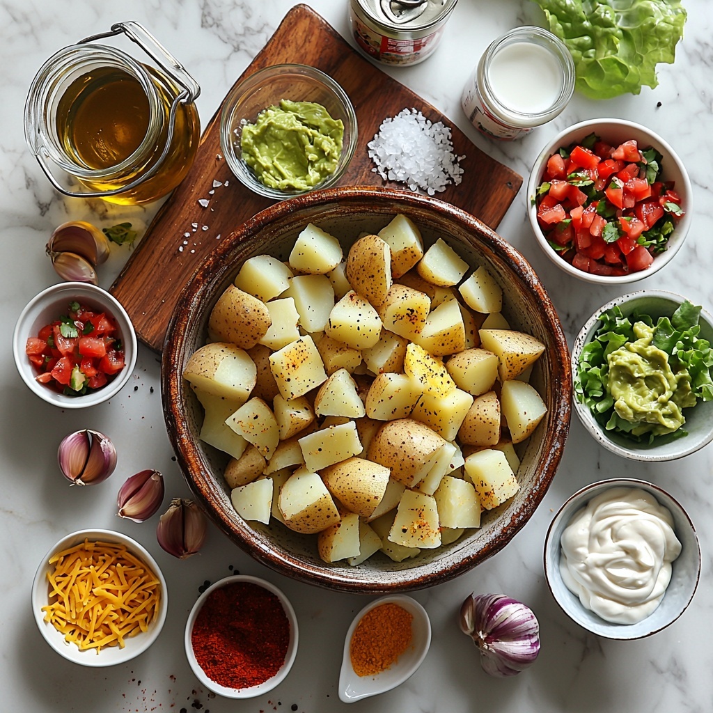 Gathering your ingredients for this Taco Potato Bowls Recipe is both straightforward and exciting because each one plays a vital role in bringing this colorful, delicious dish to life. From the hearty Russet potatoes to the flavorful blend of taco seasoning and cheeses, these ingredients provide the perfect balance of texture and taste.