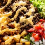 Taco Potato Bowls are a hearty and flavorful meal that combines seasoned roasted potatoes with savory taco-seasoned ground beef and a creamy cheese sauce. Topped with classic taco fixings like shredded lettuce, guacamole, sour cream, and pico de gallo, these bowls offer a delicious fusion of comfort food and Mexican-inspired flavors, perfect for family dinners or meal prepping.